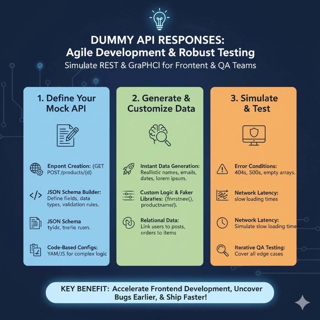The infographic titled “DUMMY API RESPONSES: Agile Development & Robust Testing” explains how simulating REST and GraphQL APIs supports frontend and QA teams.