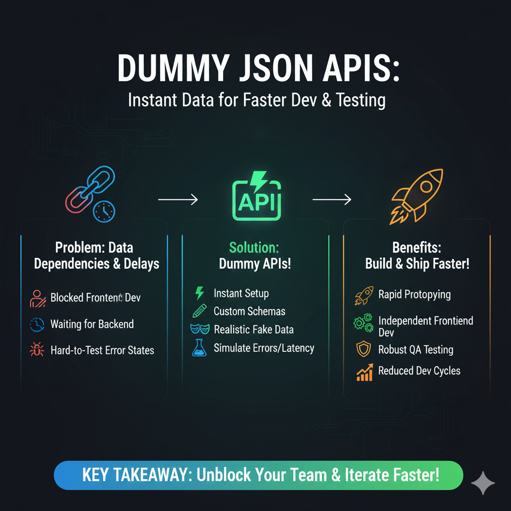 The image is an infographic titled “DUMMY JSON APIS: Instant Data for Faster Dev & Testing”. It uses a three-column structure to clearly outline the problem dummy APIs solve, the solution they provide, and the resulting benefits for development teams.